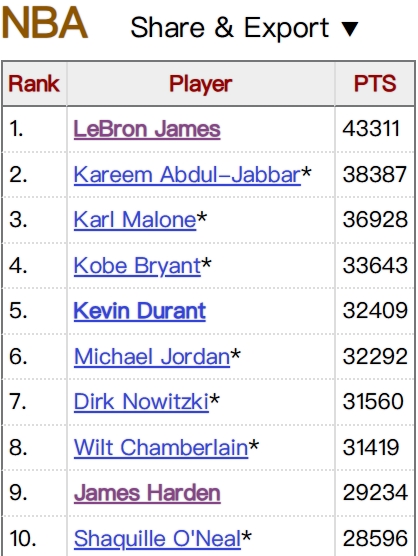 他的职业生涯总得分已经来到43311分,距离领先历史得分榜第二名的贾巴尔5000分仅差76分。