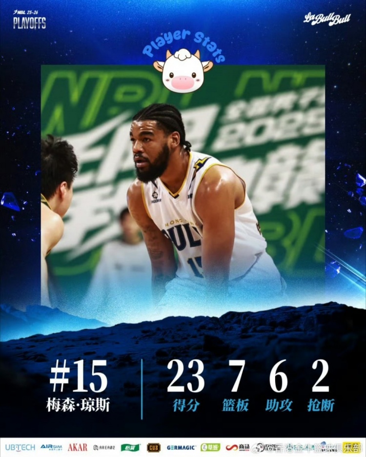 香港金牛在半决赛对阵江西鲸裕清酒的首场比赛中旗开得胜,四名外援均得分上双,表现亮眼。琼斯连突带投,砍下全队最高的23分7篮板6助攻;所罗门贡献精彩暴扣,拿到13分9篮板外加4次抢断;阿诺斯克和庞兹也分别贡献12分1抢断、11分5抢断2助攻1篮板。
