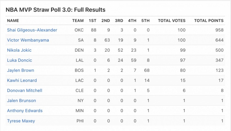 4月3日讯 近日,ESPN公布赛季第三次MVP模拟投票结果,亚历山大获得了88张第一选票、总得分958分排名第一,他与文班亚马一并成为唯二出现在全部100张选票上的球员。