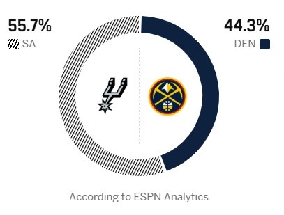 ESPN预测本场比赛胜率:马刺55.7%,掘金44.3%。