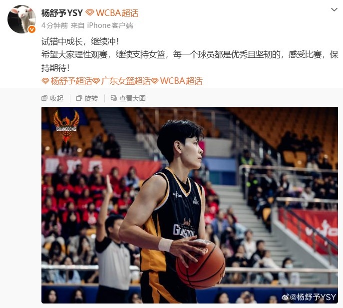 4月4日讯 今天,广东女篮球员杨舒予更新了个人微博。杨舒予晒出一张自己的比赛照片,并写道:“试错中成长,继续冲!“希望大家理性观赛,继续支持女篮,每一个球员都是优秀且坚韧的,感受比赛,保持期待!”此前结束的WCBA季后赛首轮,卫冕冠军东莞女篮遭江苏女篮淘汰,首轮出局。
