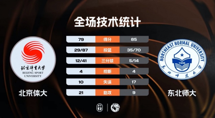 东北师大:范智博21分5板、罗俊翔17分10板、王玖豪14分5板、徐鸣阳9分13板、魏赫一9分9板、彭贺程7分、闫思恺8分