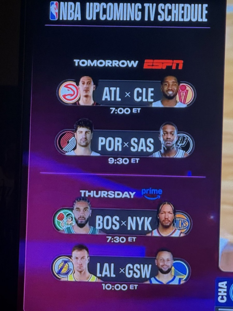 NBC晒出未来两天直播赛程为比赛预热,湖人下一场对阵勇士,两支球队的封面人物是肯纳德和库里。