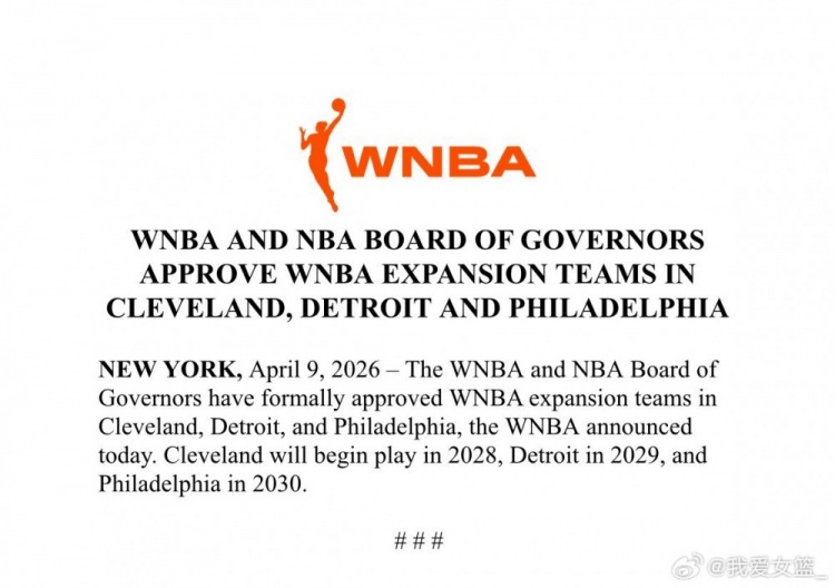 据WNBA官方消息,2026年4月9日,WNBA与NBA理事会正式批准了在克利夫兰、底特律和费城增设球队的计划。其中,克利夫兰将于2028年参赛,底特律于2029年,费城则于2030年加入联盟。