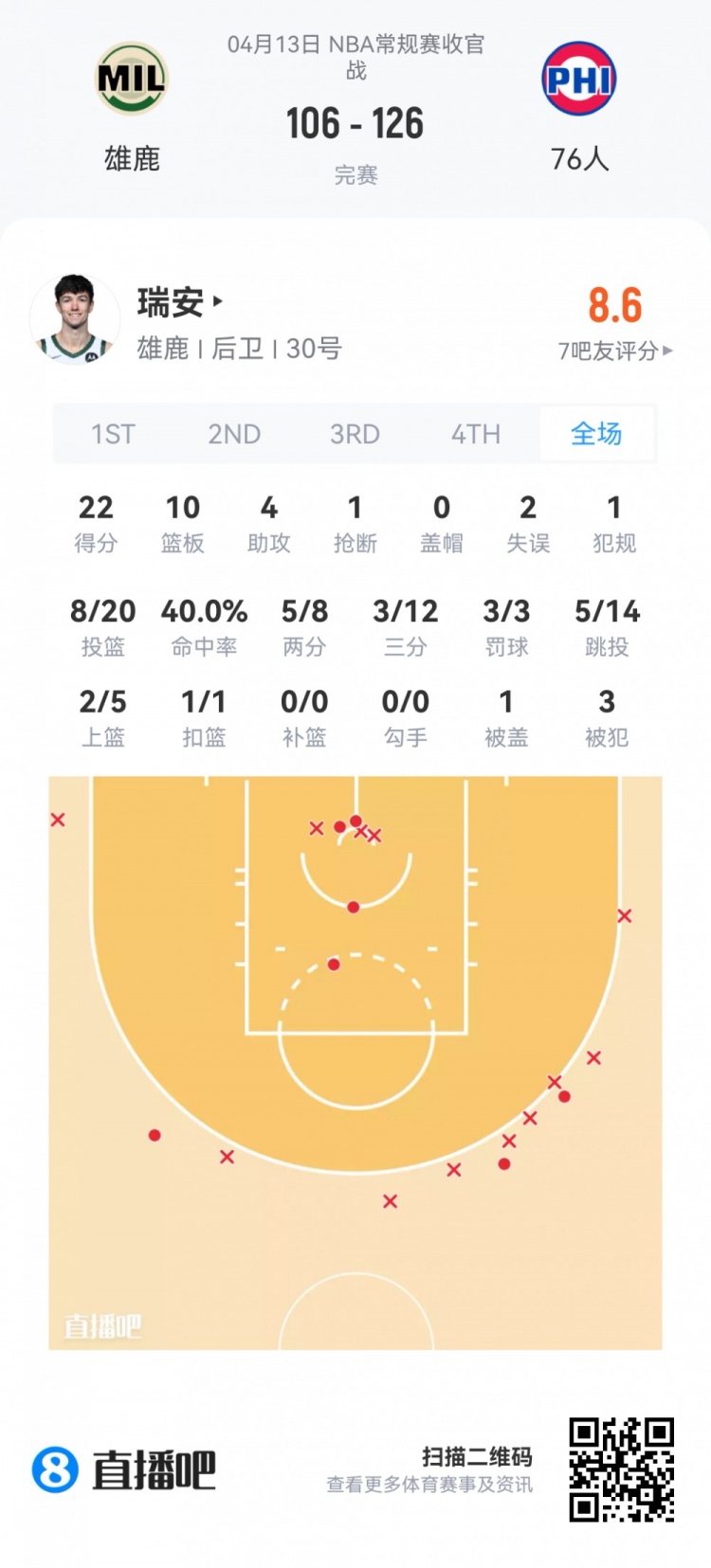 太阳次轮41号秀科比·布雷亚 登场28.7分钟