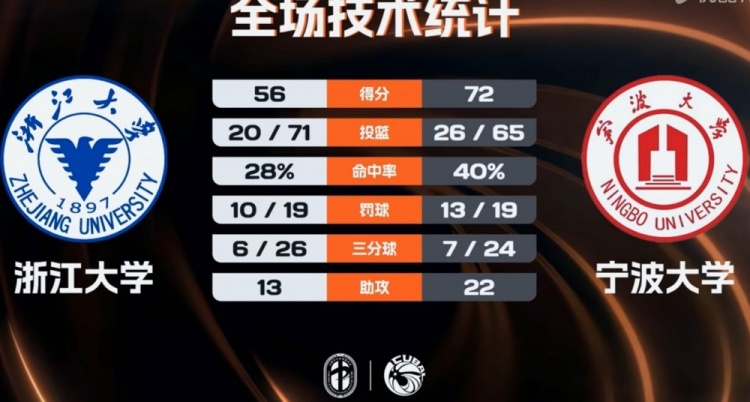 末节决战,双方展开拉锯战,李欣洋和石凯旭接连三分8-0追分,赵哲轩三分强势回应止血,双方围绕着十几分分差拉锯,随后浙江大学接连三分不中后回天乏术,最终宁波大学72-56力克浙江大学。