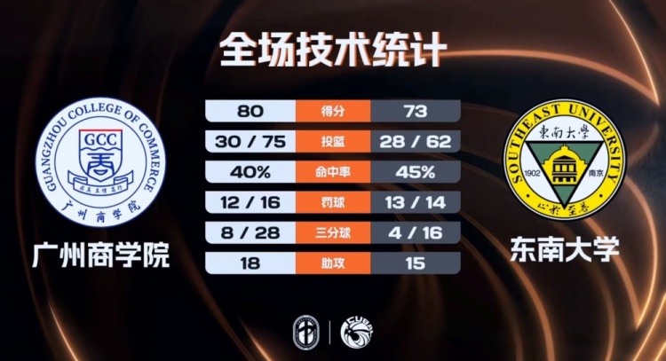 末节比赛,广州商学院的命中率出现下滑,同时东南大学也终于找回进攻感觉,后者成功将分差缩小回个位数,不过由于此前分差过大,东南大学还是没能获得逆转比赛的机会,最终广州商学院80-73战胜东南大学。