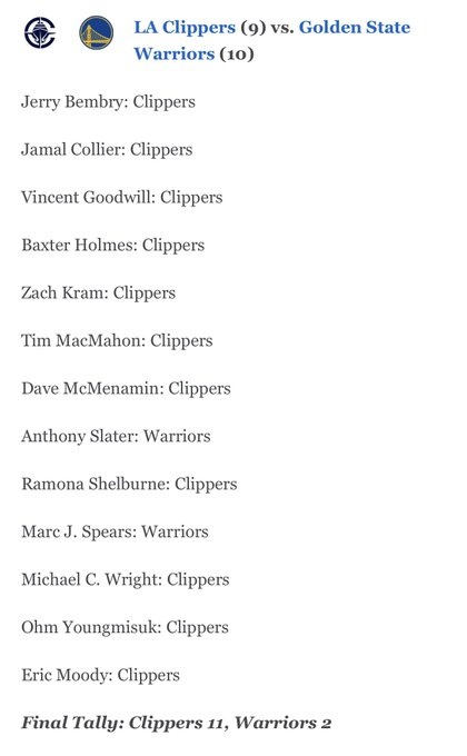 啪啪打脸!ESPN专家团赛前11人预测快船获胜 仅2人预测勇士获胜