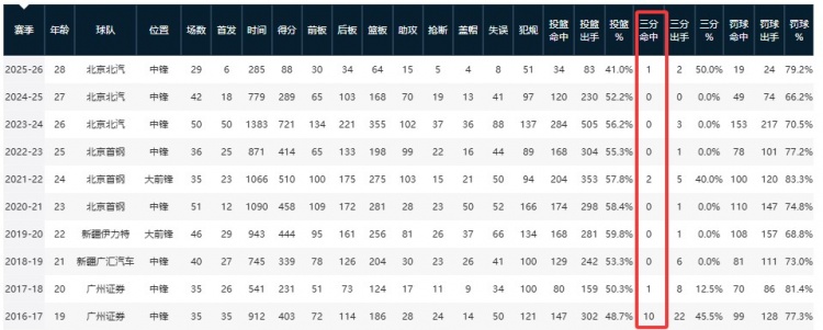 4月17日讯 CBA常规赛,北京对阵山东。比赛第四节刚开始,范子铭接队友妙传三分命中。担任本场解说嘉宾的前国手丁彦雨航不禁感叹道:“不可思议啊。”值得一提的是,这是本赛季范子铭投进的第2个三分。以下是范子铭各个赛季的三分命中数: