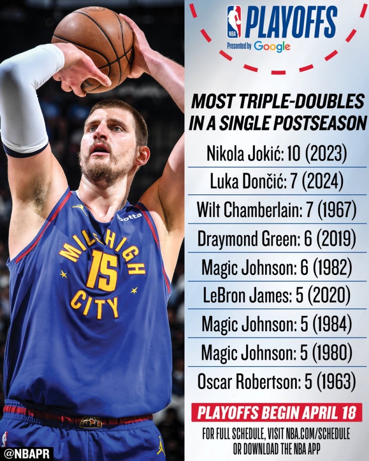 约基奇单个季后赛曾轰下10次三双 NBA历史第一&东契奇7次并列第二