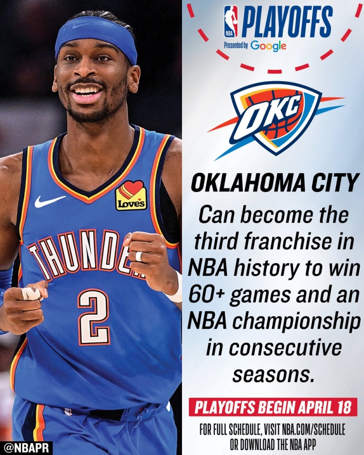 雷霆有望成为NBA历史上第三支连续两个赛季常规赛拿下60+胜场并夺冠的球队,此前只有湖人和公牛做到过这一点。