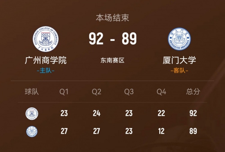 第四节,厦门大学突然哑火,广州商学院大举反击,内外开花轰出17-0的攻击波强势反超,郑博文艰难破荒,厦门大学苦苦追赶,广州商学院稳扎稳打保持优势,最终,广州商学院92-89力克厦门大学。