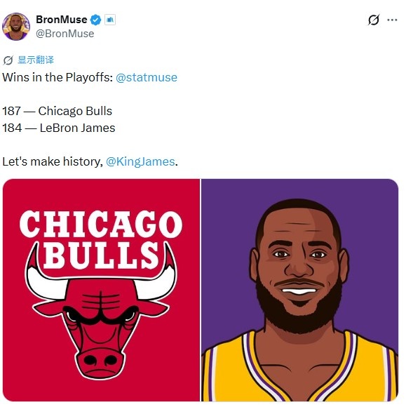 据统计,詹姆斯生涯至今的季后赛总胜场数为184场,而公牛队史的季后赛总胜场为184场。