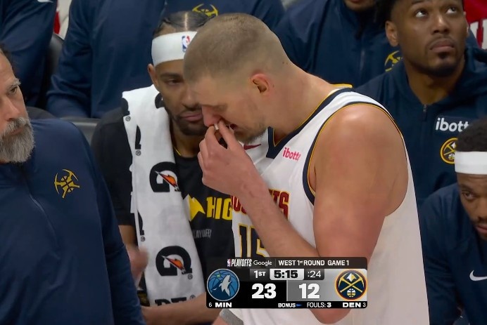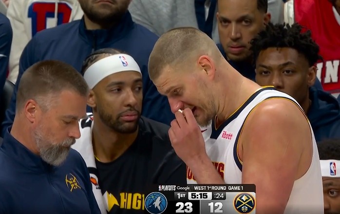 被打到了?约基奇鼻子出血 但无碍随后三分一箭穿心