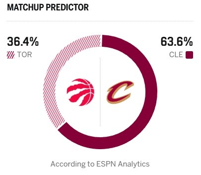 ESPN今日给出本场胜率预测,骑士高达63.6%,猛龙36.4%。