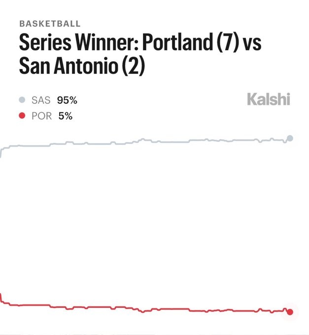 赛后预测平台Kalshi Sports更新了这轮系列赛晋级概率:马刺95%,开拓者5%。