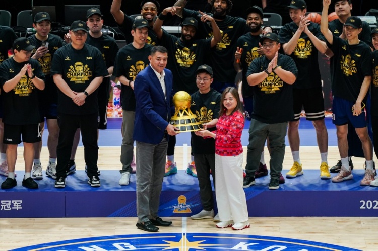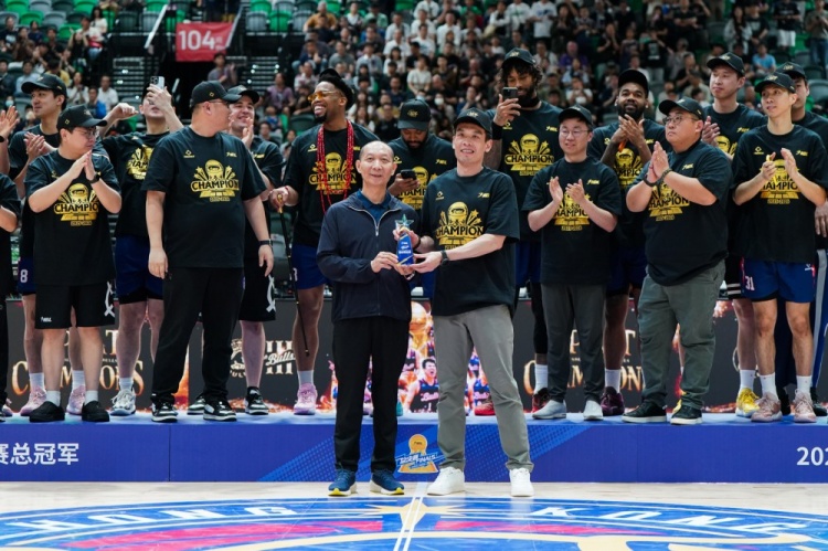 在颁奖仪式的最后环节,全场灯光聚焦,现场氛围逐渐推向高潮。随着万众瞩目的时刻到来,中国篮球名人堂入堂人物巩晓彬与中国香港特别行政区政府文化体育及旅游局局长罗淑佩女士,JP共同登场,将象征NBL联赛最高荣誉的总冠军奖杯颁发给香港金牛。掌声与欢呼声此起彼伏,见证球队在主场加冕的荣耀时刻。