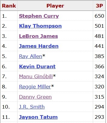 至此,塔图姆季后赛生涯三分命中数来到294记,追平JR·史密斯,并列NBA历史第十名。