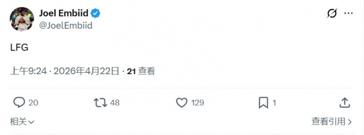 因伤(阑尾切除术后恢复)缺阵的恩比德发推写道:“让我们TM冲啊!”