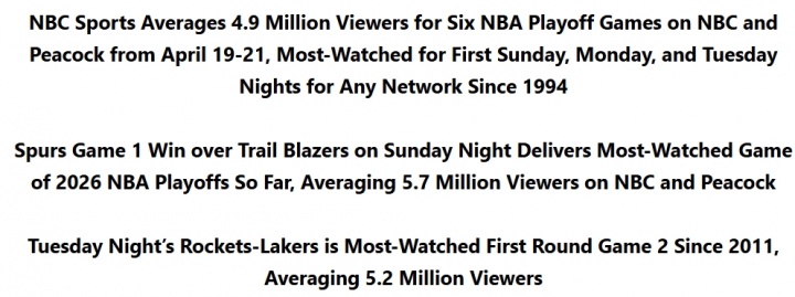 04月25日讯 今日,NBA官方PR宣布,从4月19-21日在NBC和Peacock平台所播出的六场NBA季后赛,平均吸引490万观众。创下了自1994年以来电视节目在周日、周一及周二晚间比赛里的最高收视纪录。此外,开拓者VS马刺G1为本赛季季后赛目前为止收视最高的比赛——平均吸引570万观众。而火箭VS湖人G2是自2011年以来收视率最高的首轮G2比赛——平均吸引520万观众。
