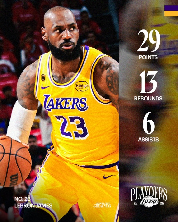 4月25日讯 NBA附加赛,湖人在客场以112-108加时击败火箭,系列赛3-0领先。此役,詹姆斯出战45分4秒,投篮22中10,三分9中4,罚球6中5,得到29分13篮板6助攻3抢断1盖帽7失误。湖人赛后发布詹姆斯数据海报,配文:“这家伙真的无解!”