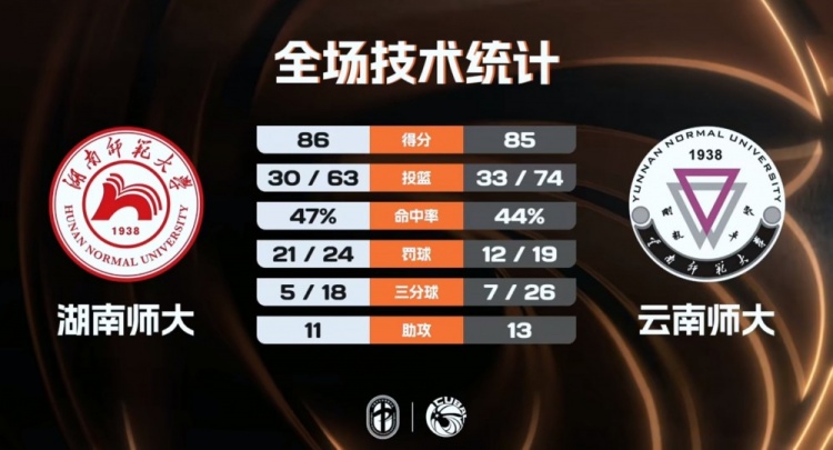 末节比赛,双方打得异常胶着,场上比分交替领先,比赛悬念保持到了最后,关键时刻温常鑫命中三分迫近比分,湖南师大的失误给了李建墙反超两分的机会,不过李一辰很快就两分完成准绝杀,皮昌盛后场的绝杀三分不中,最终湖南师大86-85险胜云南师大。