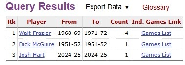 据统计,尼克斯队史近50年来仅唐斯和哈特在季后赛砍下过三双,榜单详情如下: