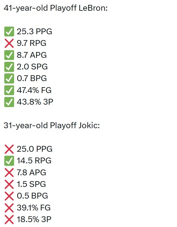4月26日讯 今天,美媒Witness King James晒出了本赛季季后赛41岁詹姆斯和31岁约基奇的场均数据,除篮板球外,詹姆斯各项数据均领先约基奇,详情如下:詹姆斯场均能得到25.3分9.7篮板8.7助攻2.0抢断0.7盖帽,投篮命中率47.4%,三分命中率43.8%;约基奇场均能得到25分14.5篮板7.8助攻1.5抢断0.5盖帽,投篮命中率39.1%,三分命中率18.5%。
