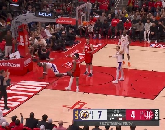 4月27日讯 NBA季后赛首轮G4,火箭主场迎战湖人的比赛进行中。首节刚开始不久,火箭抢断反击2打1打转换,小贾巴里·史密斯传给跟进的申京,但申京还想吊给阿门空接,但没传好失误,艾顿卡好位置还造成申京推人犯规,最终球权转换。