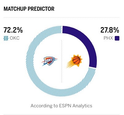 太阳成首支出局球队?ESPN预测明日胜率:太阳27.8% 雷霆72.2%