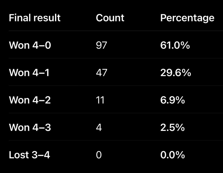 历史159次系列赛3-0最终结果:4-0获胜 | 97次 | 占比61.0%4-1获胜 | 47 | 29.6%4-2获胜 | 11 | 6.9%4-3获胜 | 4 | 2.5%3-4失利 | 0 | 0.0%