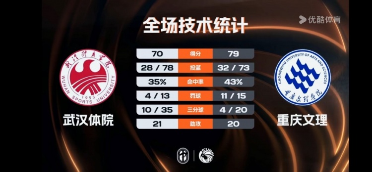 重庆文理:张玉欣21分8助4断,杨屿桐20分5板,周思蕴18分22板7助,秋菊10分11板,胡瑞珂10分6板