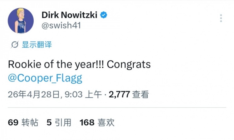 4月28日讯 此前NBA官方宣布,独行侠状元弗拉格当选本赛季的最佳新秀。名宿诺维茨基也更新了社媒对弗拉格进行祝贺:最佳新秀!!!祝贺@弗拉格弗拉格本赛季为独行侠出战了70场常规赛,场均33.4分钟,可以得到21分6.7篮板4.5助攻1.2抢断,投篮命中率46.8%,三分命中率29.5%,罚球命中率82.7%。