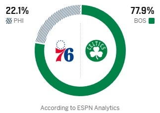 ESPN预测本场比赛胜率,凯尔特人77.9%,76人22.1%。