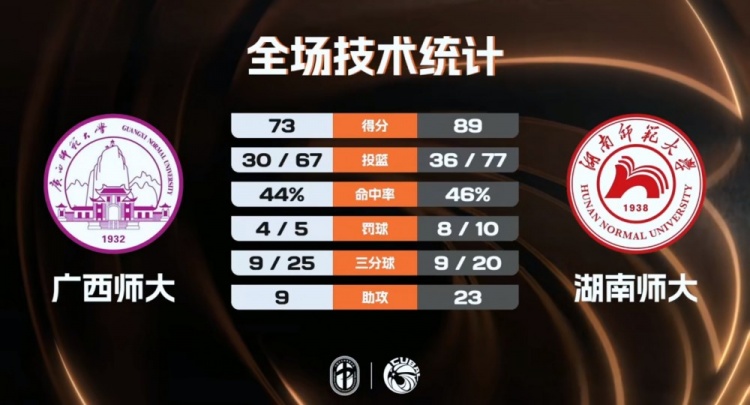 末节比赛,广西师大继续发起追分,他们利用一波7-2的攻势终于追回到个位数,分差最小时仅剩7分,好在是湖南师大及时稳住阵脚,分差重新来到十分以上,最终湖南师大89-73轻取广西师大成功晋级。