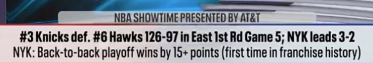 4月29日讯 NBA季后赛东部首轮G5,尼克斯126-97大胜老鹰。转播方晒出一组数据:尼克斯在季后赛背靠背净胜对手15+,这是队史第一次做到这点!值得一提的是,纽约尼克斯成立于1946年并加入美洲篮球协会(BAA,NBA的前身),是从最初的BAA联盟开始就没有搬迁过城市的两支球队之一(另外一支是波士顿凯尔特人队),至今已有80年的队史了!