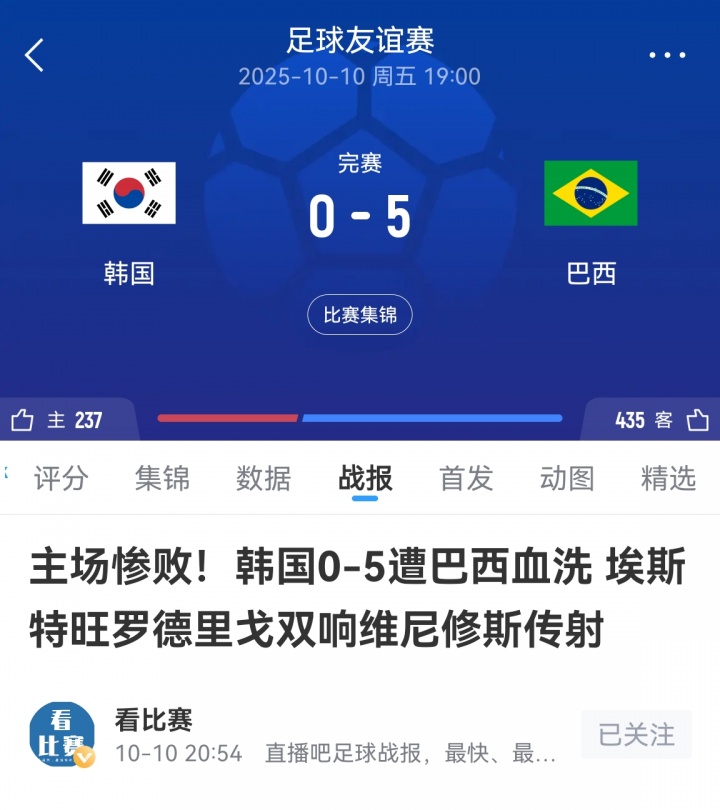 4天前在韩国,巴西队5-0横扫韩国队。