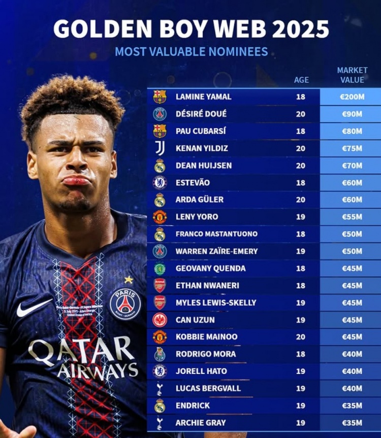 10月29日讯 金童奖在本月已经公布了候选名单,《转会市场》也统计了今年候选者的身价情况,亚马尔无悬念居首。