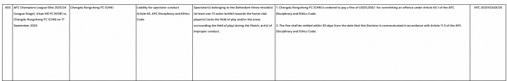 1-成都蓉城俱乐部因违反亚足联《纪律与道德准则》第65.1条,被责令支付3000美元罚款。