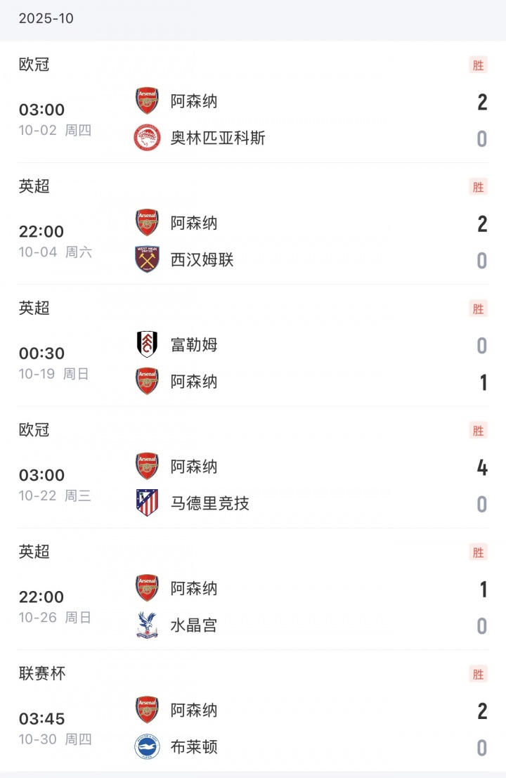 10月30日讯 阿森纳刚刚度过了完美的10月,球队在在英超、欧冠、联赛杯赛场6战全胜,打入12球,一球未丢。本赛季阿森纳14场比赛仅丢3球,进球的球员分别是索博斯洛伊、哈兰德和沃尔特马德。进入11月,阿森纳将首先迎来伯恩利、布拉格斯拉维亚和桑德兰的挑战,随后就是北伦敦德比和对阵拜仁。