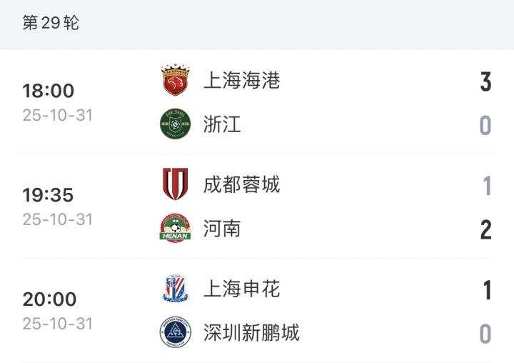 11月03日讯 中超第29轮,成都蓉城输球退出争冠行列,上海海港、上海申花保留争冠悬念,两队需要等待22天方才揭晓冠军归属。