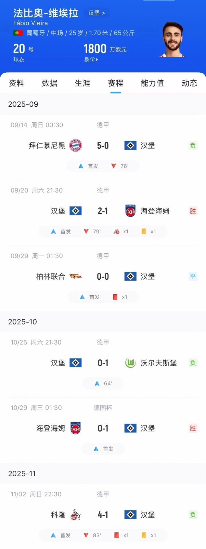 11月03日讯 德甲第9轮科隆4-1完胜汉堡,阿森纳租将法比奥-维埃拉再度染红,本赛季出战5轮德甲已经拿到2张红牌,同期数据则为0球1助。本场比赛第74分钟,维埃拉拉人犯规,吃到第一张黄牌。第83分钟,他又因为与裁判争论而吃到第二黄,被罚下场时他显得情绪激动。此前第5轮对阵柏林联合时,维埃拉亮鞋钉踢到对手,吃到直红。↓