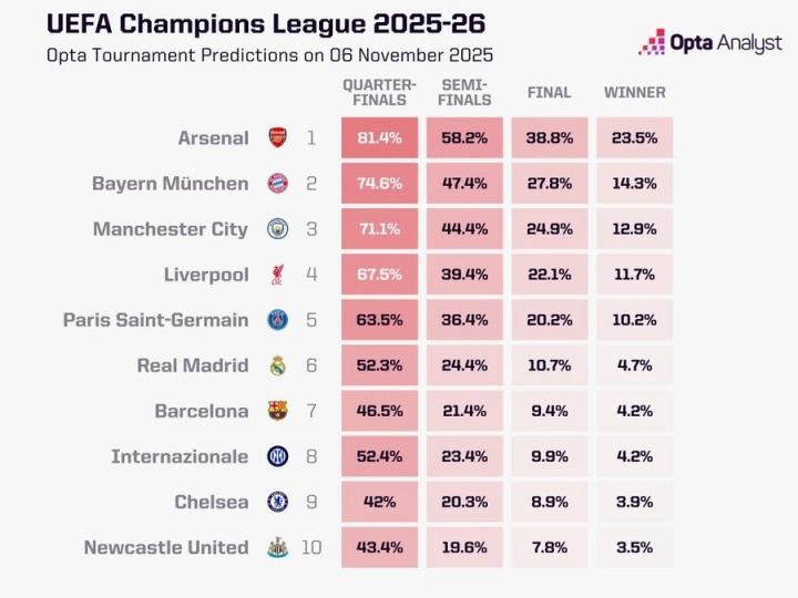 11月06日讯 欧冠联赛阶段第4轮的比赛已经全部结束,OPTA超算更新了欧冠夺冠概率。