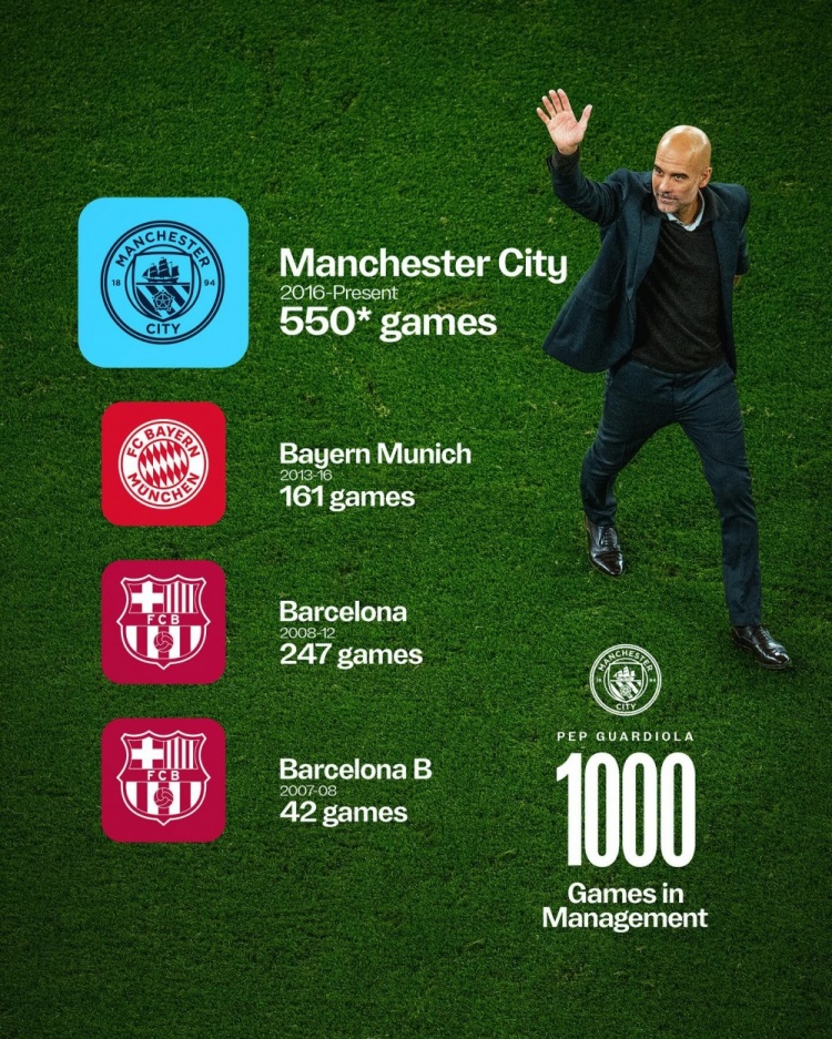 11月8日讯 北京时间11月10日凌晨,曼城将在英超第11轮比赛中主场对阵利物浦。此役将是瓜迪奥拉执教生涯带队参加的第1000场比赛,曼城官方社媒晒出瓜帅执教场次的分布。瓜迪奥拉执教千场分布:曼城(2016年至今)——550场(本轮计入)拜仁(2013年到2016年)——161场巴萨(2008年到2012年)——247场巴萨B队(2007年到2008年)——42场