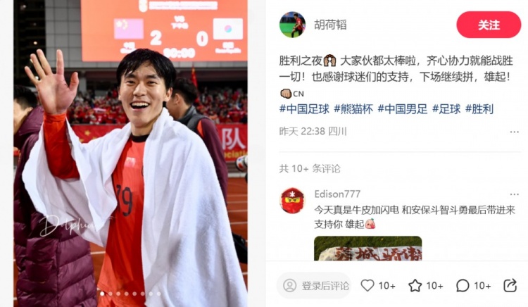 熊猫杯第二轮,U22国足战胜韩国队,本场打满全场的胡荷韬更新社媒庆祝。