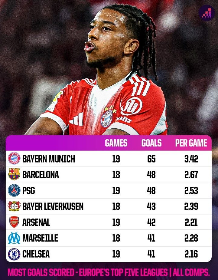 11月27日讯 数据网站OPTA盘点了本赛季欧洲五大联赛球队在各项赛事总进球榜,具体如下:1、拜仁 19场65球,场均3.42球2、巴萨 18场48球,场均2.67球3、巴黎 19场48球,场均2.53球4、勒沃库森 18场43球,场均2.39球5、阿森纳 19场42球,场均2.21球6、马赛 18场41球,场均2.28球7、切尔西 19场41球,场均2.16球