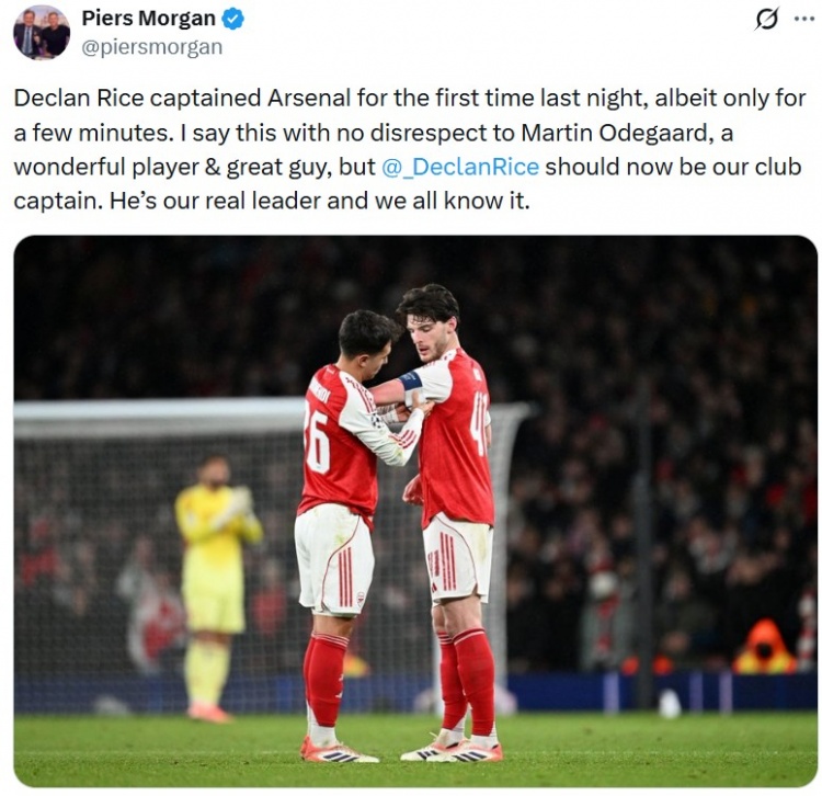 11月27日讯 在本轮欧冠阿森纳3-1击败拜仁的比赛中,赖斯当选全场最佳球员。阿森纳拥趸摩根在社媒晒出赖斯本场戴上队长袖标的照片,写道:“赖斯昨晚比赛中首次戴上阿森纳队长袖标,尽管只有几分钟。我这么说并不是出于对厄德高的不敬,他也是一名出色的球员、很棒的伙计,但是赖斯现在应该成为球队队长了,他是我们真正的领袖,这我们都知道的。”