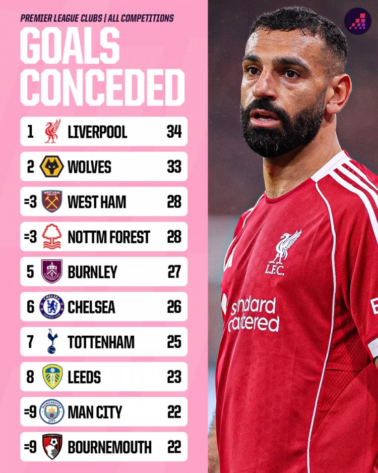 11月29日讯 Opta统计了本赛季英超球队在所有赛事中的丢球数量,并列出榜单,利物浦丢34球最多,狼队丢33球次席。本赛季英超球队丢球排名(所有赛事):利物浦——34狼队——33西汉姆——28诺丁汉森林——28伯恩利——27切尔西——26热刺——25利兹联——23曼城——22伯恩茅斯——22