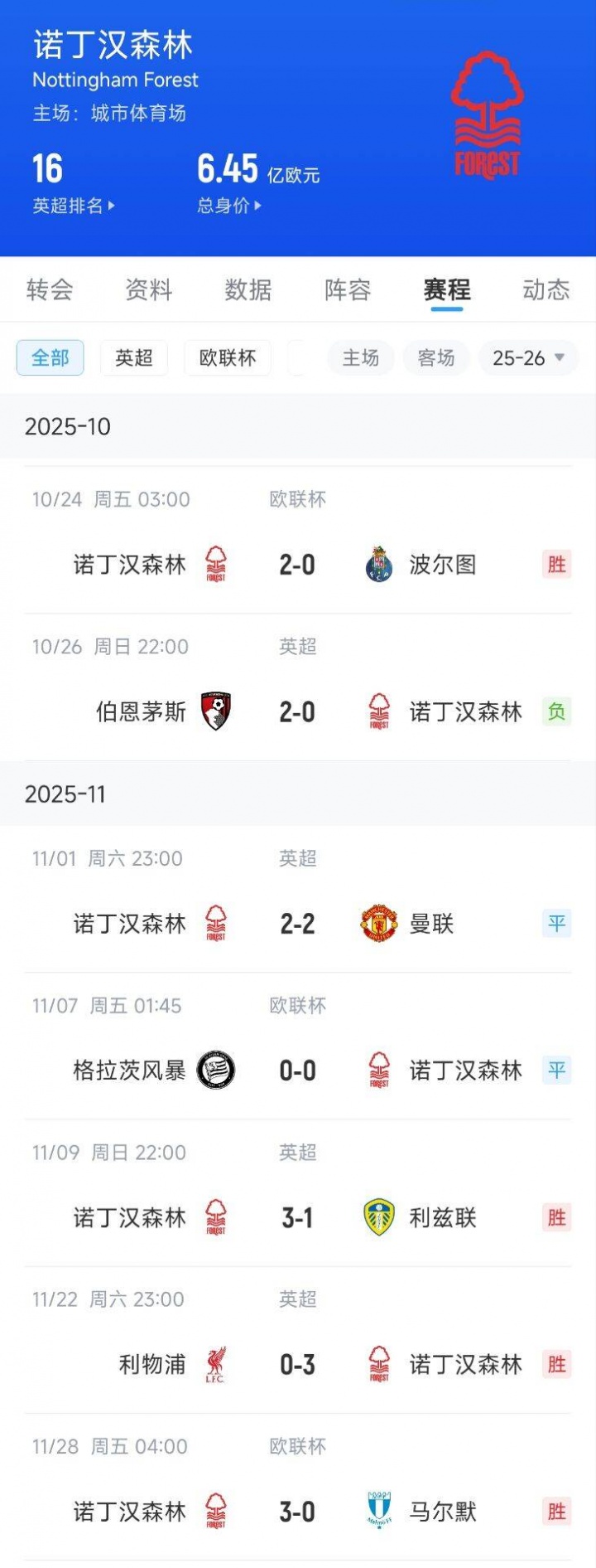 英超赛场森林同样状态回温,主帅戴奇上任之后,除了首场0-2不敌伯恩茅斯,随后便2胜1平砍下7分。这3场不败包括2-2曼联,3-1利兹联和3-0利物浦。如今他们逃离英超降级区,排名第16位。