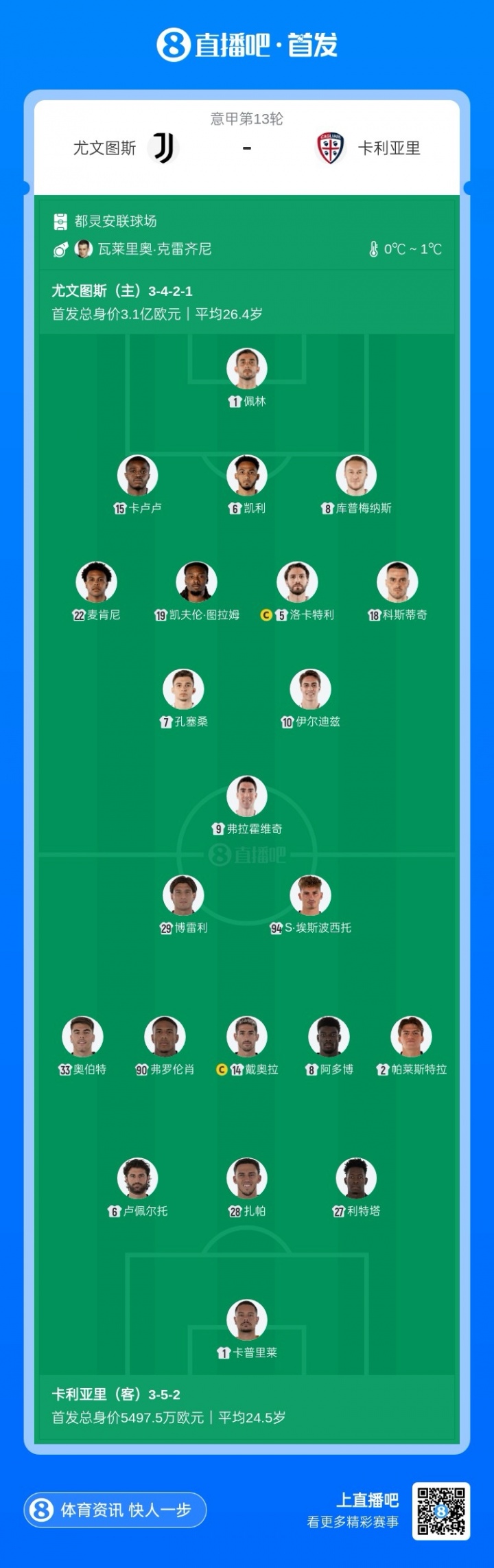 11月29日讯 意甲第13轮,尤文对阵卡利亚里,赛前首发公布。